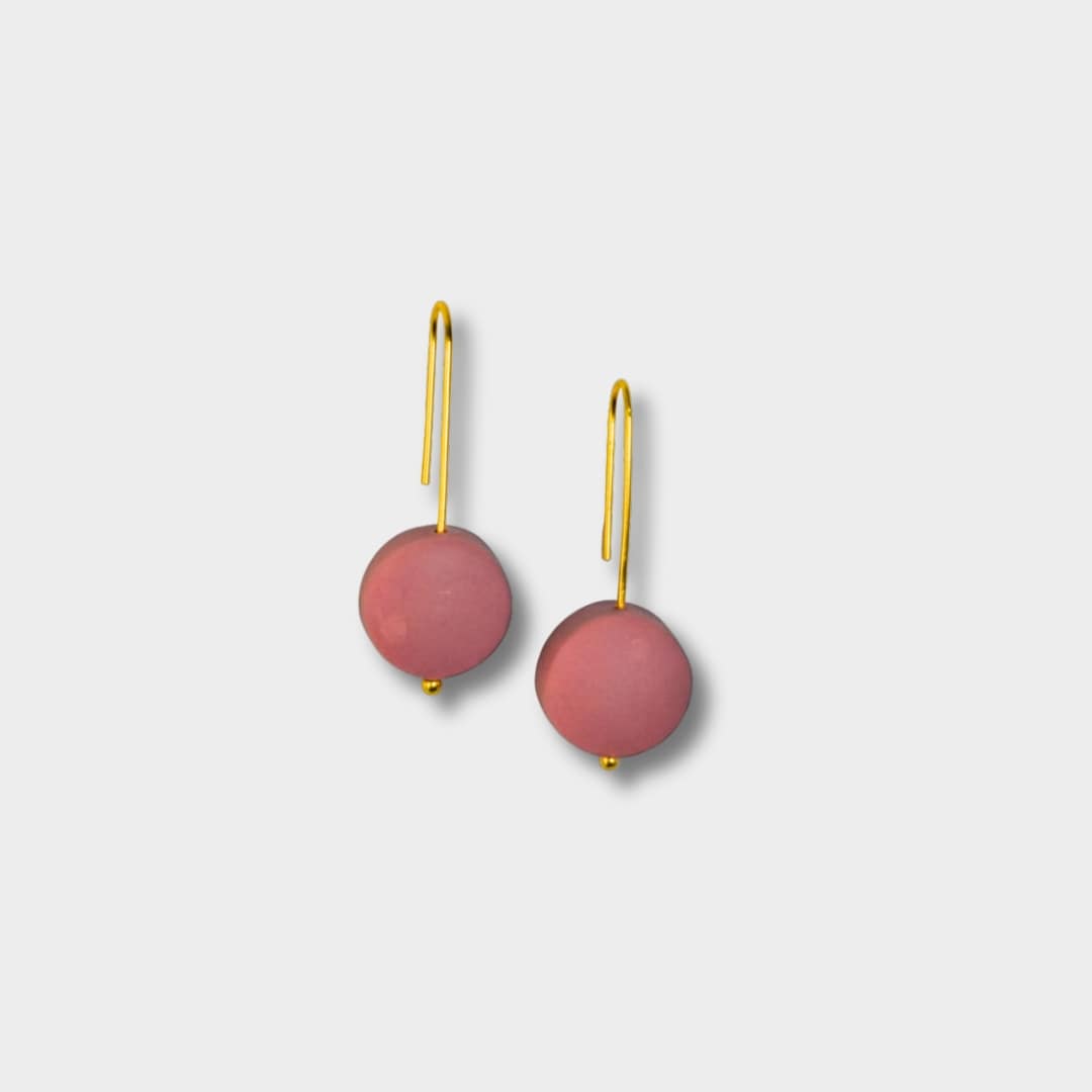 Alma is a pair of handcrafted earrings built around simplicity and proportion. A single matte clay bead — rounded on the front with a flat back — hangs from a slim hook in 18k gold-plated sterling silver. The shape is clean and understated, allowing colour and material to speak for themselves.