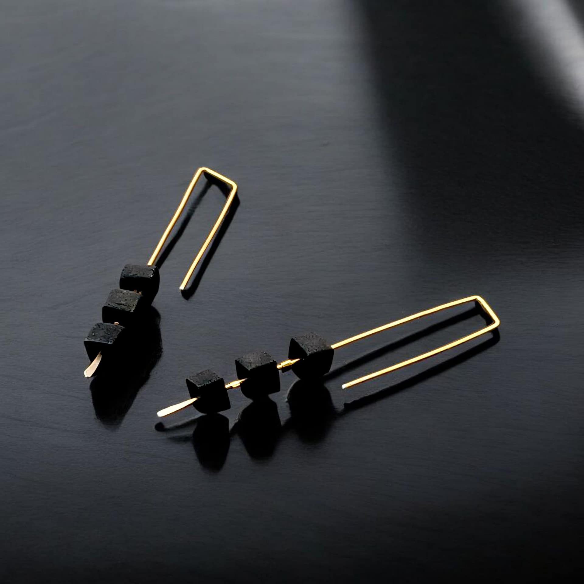 The elongated hook gives the earrings a clean, linear silhouette that feels both modern and timeless. Each cube is shaped by hand, giving every pair its own distinct character and a tactile, organic edge.