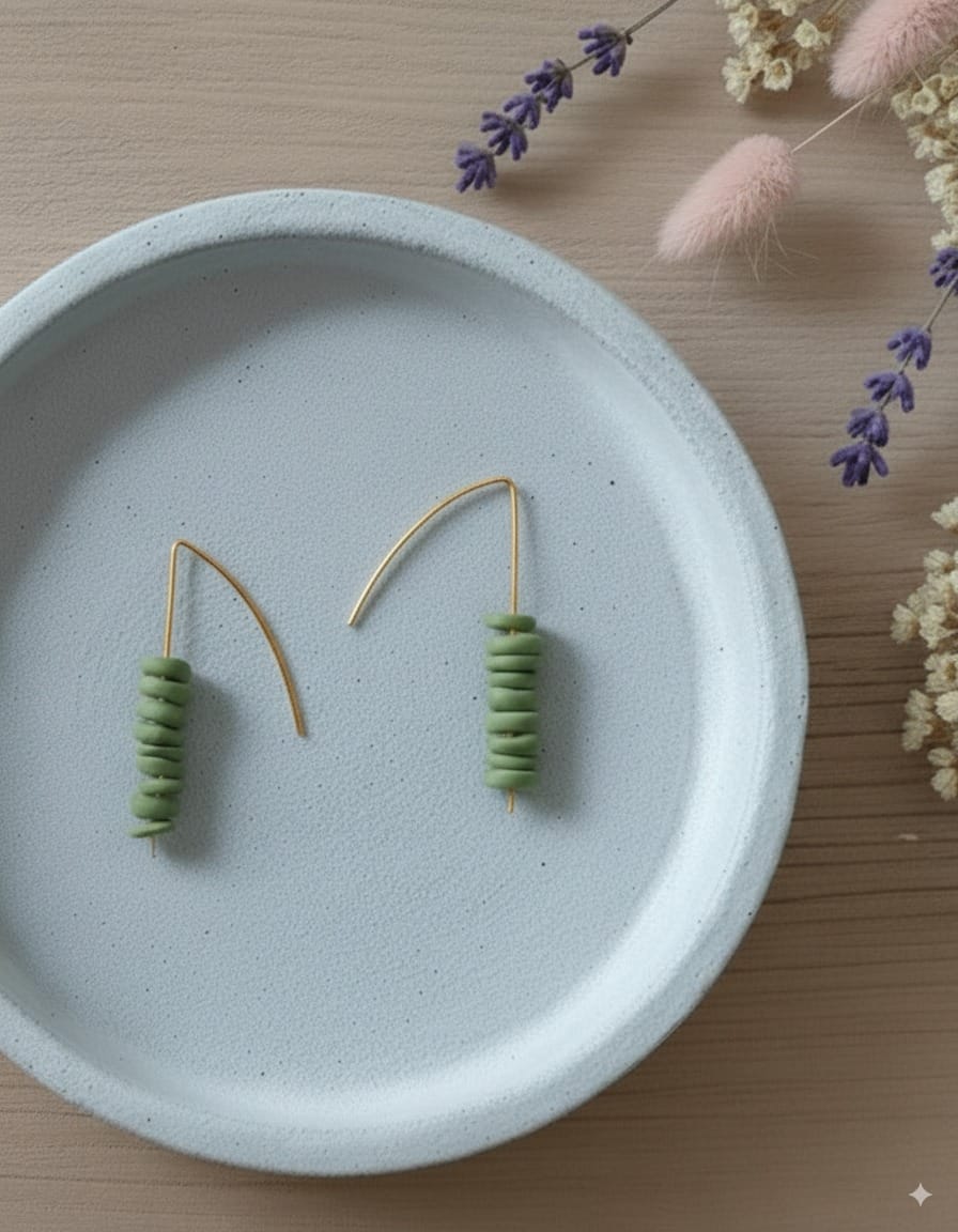 Nora is a pair of handcrafted earrings inspired by the muted tones and natural textures of the Scandinavian beach. Soft sage-green clay discs are stacked in an organic column, creating a subtle rhythm that feels both refined and quietly playful. The matte clay contrasts beautifully with the clean curve of the 18k gold-plated sterling silver hook, giving the earrings a look that is both cool and warm — a balance of Nordic minimalism and soft, rounded forms.