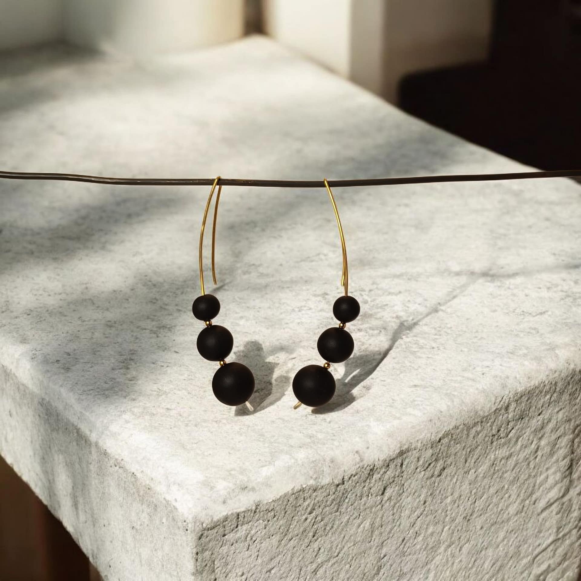 Saga is a pair of handcrafted earrings combining simplicity with bold expression. Three matte black clay pearls are carefully balanced on a minimal 18k gold-plated sterling silver ear hook, creating a clean silhouette with a sculptural feel. The earrings curve gently, a shape that adds elegance while subtly elongating the line of the neck.